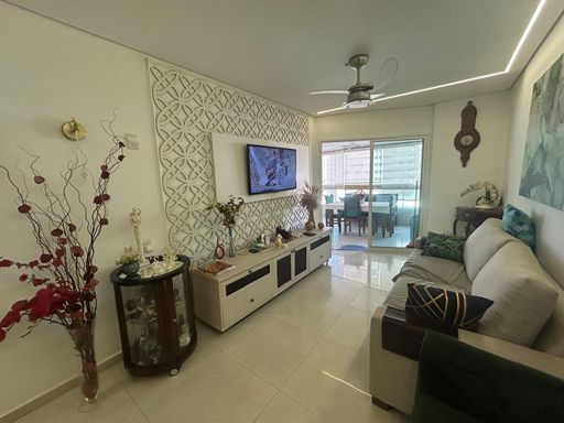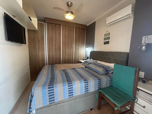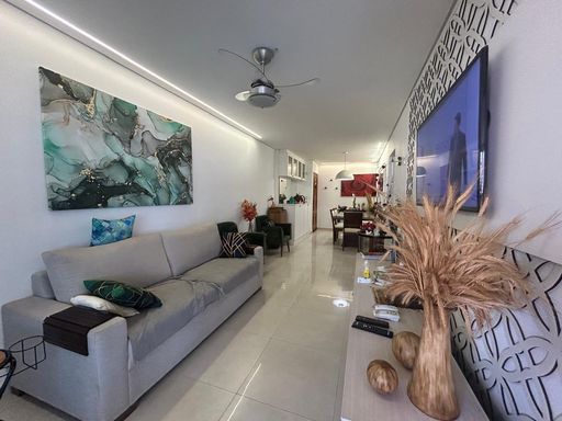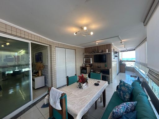 Os móveis planejados agregam sofisticação e funcionalidade, otimizando cada espaço com muito bom gosto. A sala se integra de forma harmoniosa à varanda envidraçada, criando um ambiente aconchegante e versátil, perfeito para momentos de descanso ou para receber amigos e familiares, sempre com o diferencial de uma agradável vista para o mar.