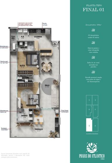 São apartamentos com duas suítes e lavabo, todos com fino acabamento e varanda gourmet como ambientes integrados, com até 108 m de área útil e duas vagas de garagem.