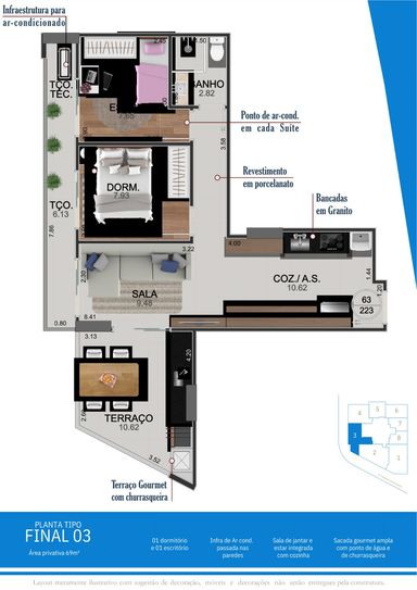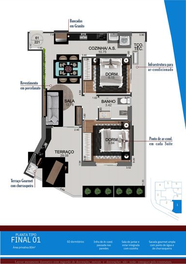 O empreendimento conta com 8 plantas tipo, com metragens que variam de 36m² a 82,83m², distribuídas em flats de 1 e 2 dormitórios, todos com 1 vaga de garagem. Ambientes inteligentes, pensados para quem busca conforto, funcionalidade e excelente aproveitamento de espaço.